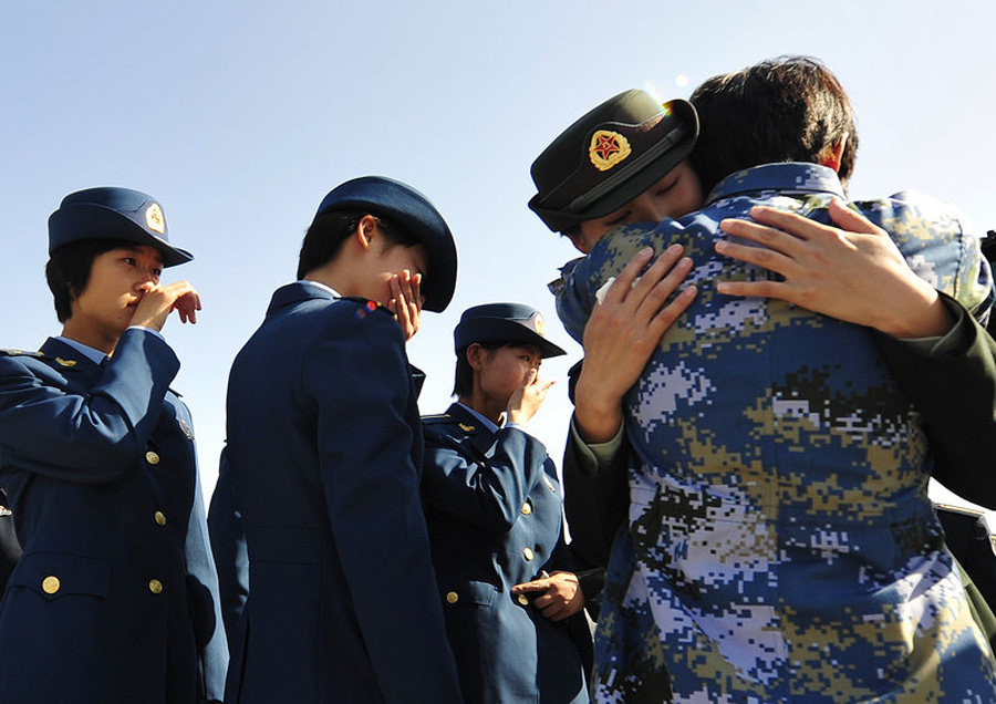 三軍女兵這些閱兵場上的鐵娘子,此時只有離別的悲傷。10月5日,北京沙河閱兵村,參加國慶60周年大閱兵的14個徒步方隊分批次撤離閱兵村,回到位于全國各地的建制部隊單位。在一曲曲送戰(zhàn)友、祝福等歌曲中,戰(zhàn)友們揮淚告別。陳杰/CFP
