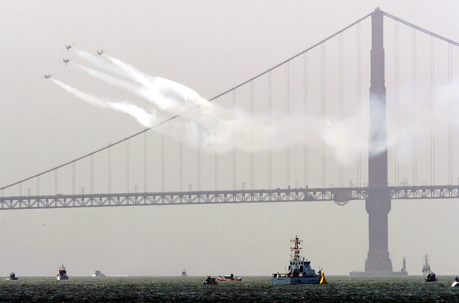 2009年10月8日,美軍飛機在舊金山灣上空進行飛行演練。一年一度的舊金山艦隊周將于10月10日開幕,屆時會有船艦游行和飛行表演等活動。 來源:中國新聞網(wǎng)