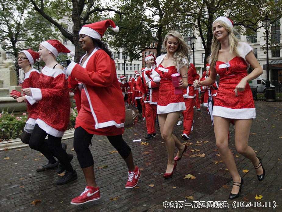 10月6日,英國(guó)倫敦市中心100多位圣誕老人為籌集乳腺癌護(hù)理善款而參加歡樂(lè)跑活動(dòng)。來(lái)源:中國(guó)新聞網(wǎng)