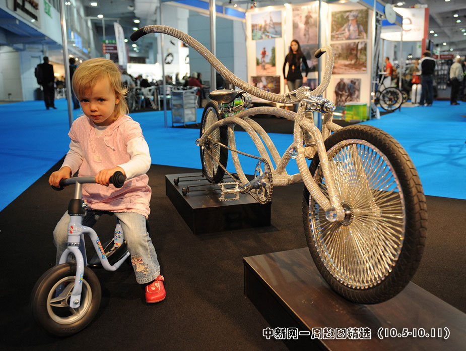 10月8日,2009自行車展在倫敦市中心開幕,超過11萬顆施華洛世奇水晶覆蓋的自行車成為有史以來最昂貴的自行車,該車由英國人本·威爾遜設計制造。來源:中國新聞網(wǎng)