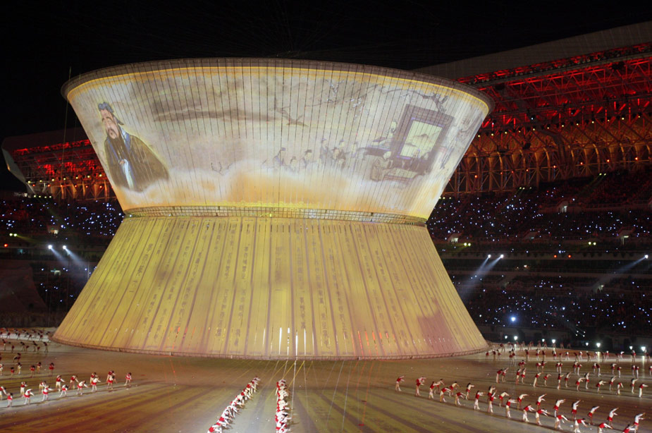 十月十六日晚,中華人民共和國(guó)第十一屆運(yùn)動(dòng)會(huì)在山東濟(jì)南奧體中心隆重開幕。圖為“孔子”現(xiàn)身全運(yùn)會(huì)開幕式。中新社發(fā) 湯彥俊 攝