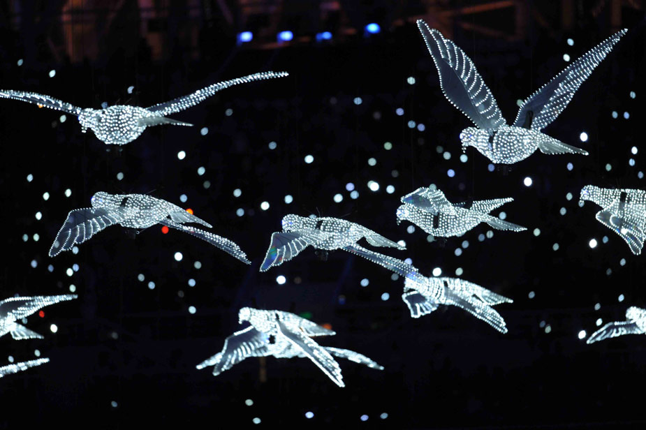 十月十六日晚,中華人民共和國第十一屆運動會在山東濟南奧體中心隆重開幕。開幕式晚會上和平鴿在體育場飛翔。中新社發(fā) 陳文 攝