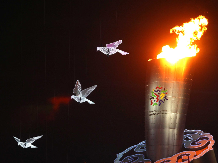 十月十六日晚,中華人民共和國(guó)第十一屆運(yùn)動(dòng)會(huì)在山東濟(jì)南奧體中心隆重開(kāi)幕。圖為第十一屆全國(guó)運(yùn)動(dòng)會(huì)圣火在山東濟(jì)南點(diǎn)燃。中新社發(fā) 富田 攝