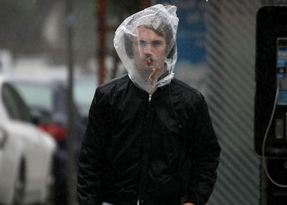 周二(10月13日),美國舊金山街頭一位行人用塑料袋套在頭上,抵擋暴雨。圖片來源:中國新聞網(wǎng)
