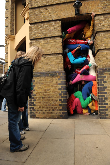 10月16日,來自奧地利的藝術(shù)家威利·多勒帶著他的城市空間人體藝術(shù)團(tuán)隊(duì),在倫敦街頭進(jìn)行藝術(shù)表演。幾十位表演者把自己的身體擠進(jìn)通道入口、壁凹和任何能找得到的公共建筑的縫隙內(nèi),供人們欣賞。