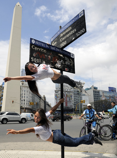 10月19日,阿根廷布宜諾斯艾利斯市街頭,鋼管舞小姐在街頭表演,路邊的路燈、電線桿變身為鋼管舞道具。圖片來源:中國新聞網(wǎng)