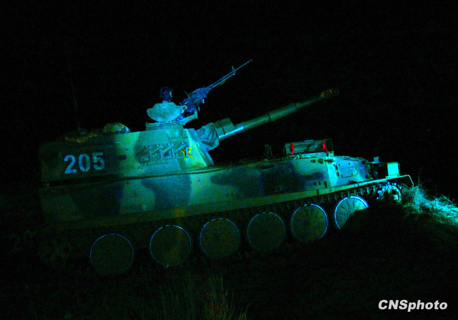 當晚國防大學防務學院、空軍指揮學院的外軍學員,以及英國、以色列、土耳其、巴基斯坦等國軍事觀察員親臨現(xiàn)場觀摩了后勤保障戰(zhàn)斗準備、自行榴彈炮占領陣地、裝甲車輛“摸黑”開進等戰(zhàn)斗要素。圖為摸黑”開進的裝甲戰(zhàn)車進入戰(zhàn)位。中新社發(fā) 宋吉河 攝