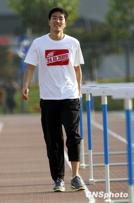 10月22日下午,“飛人”劉翔亮相濟南奧體中心田徑訓練場,在教練孫海平的帶領下,輕松備戰(zhàn)全運會。來源:中國新聞網(wǎng)