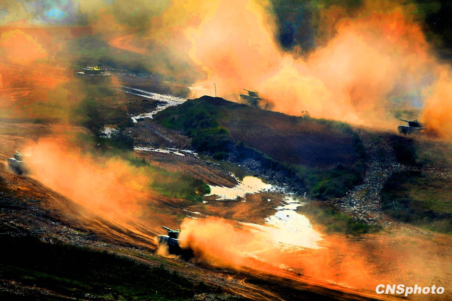 解放軍“前鋒-二00九A”演習,二十二日在濟南軍區(qū)某合同戰(zhàn)術訓練基地進行陸空聯(lián)合火力打擊實兵實彈演練。中新社發(fā) 宋吉河 攝