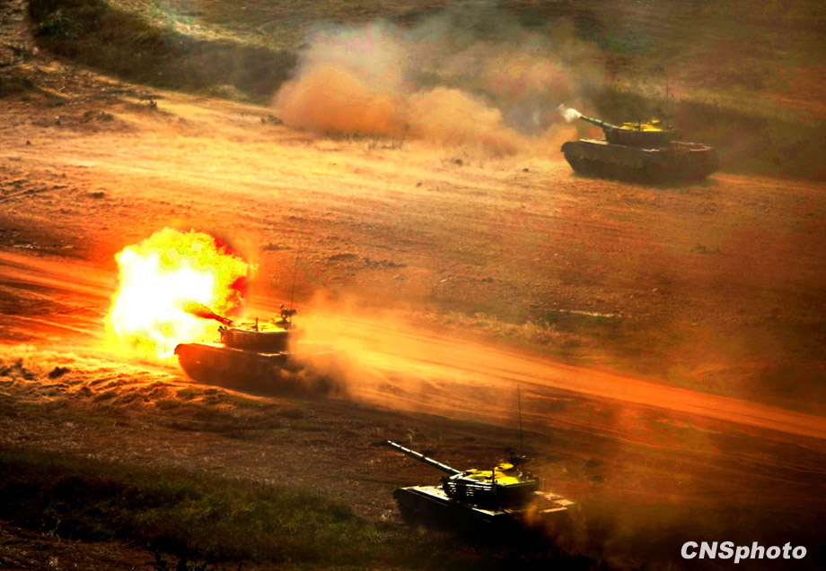 解放軍“前鋒-二00九A”演習(xí),二十二日在濟南軍區(qū)某合同戰(zhàn)術(shù)訓(xùn)練基地進行陸空聯(lián)合火力打擊實兵實彈演練。中新社發(fā) 宋吉河 攝