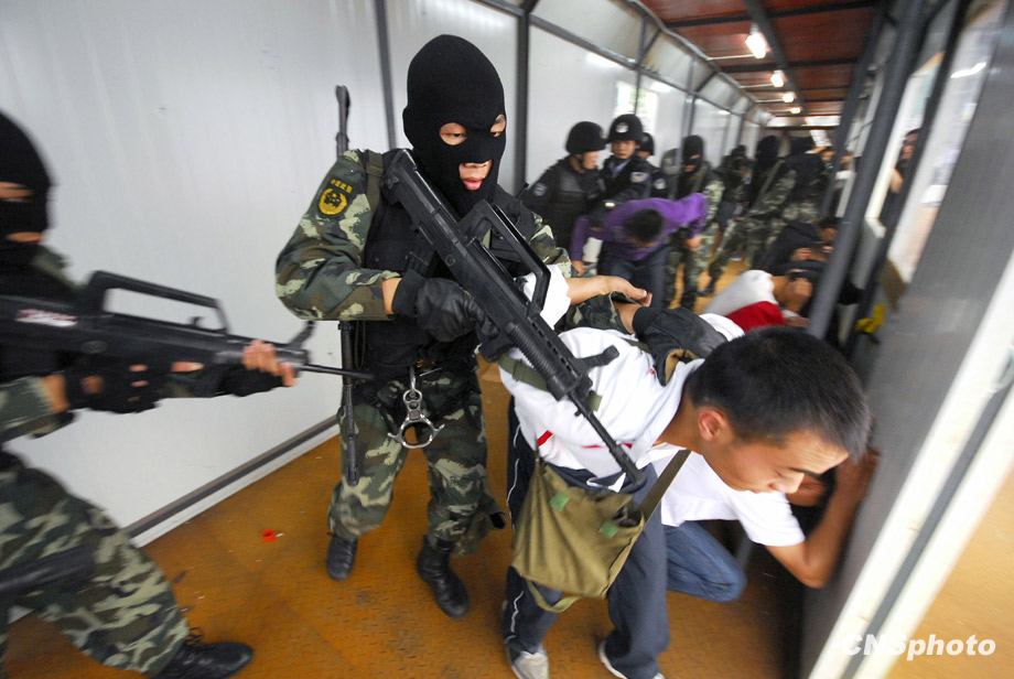 10月23日下午3時40分,推進“平安重慶”建設(shè)突發(fā)事件應(yīng)急演練在該市渝中區(qū)大田灣體育場舉行,重慶各警種突精銳力量重裝登場,將各類事件一一化解。圖為反劫持戰(zhàn)術(shù)演練中,武警特種作戰(zhàn)分隊、特警總隊突擊分隊發(fā)起攻擊,一舉捕殲了“恐怖分子”。 中新社發(fā) 郝飛 攝