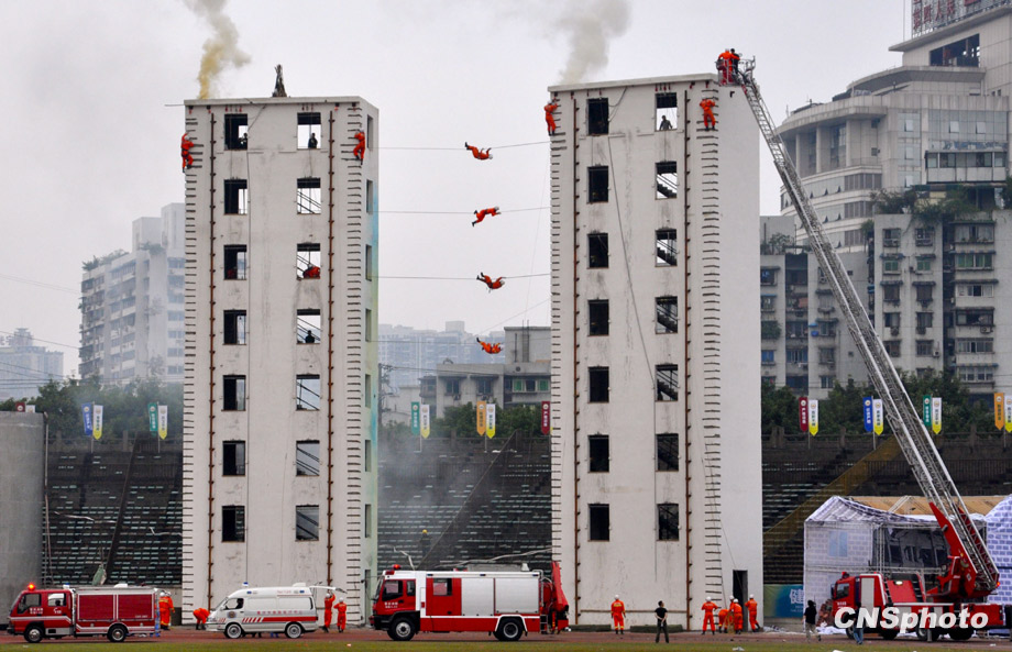 10月23日下午3時(shí)40分,推進(jìn)“平安重慶”建設(shè)突發(fā)事件應(yīng)急演練在該市渝中區(qū)大田灣體育場(chǎng)舉行,重慶各警種突精銳力量重裝登場(chǎng),將各類(lèi)事件一一化解。圖為高層建筑滅火救援中,消防官兵鉤梯聯(lián)掛展開(kāi)高樓營(yíng)救工作。中新社發(fā) 曹多然 攝