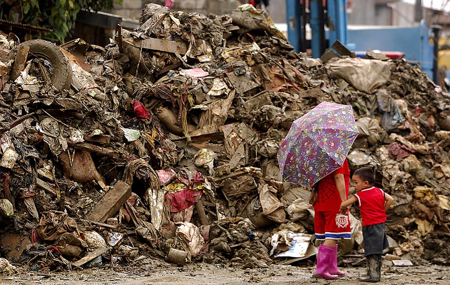 周日(18日),菲律賓馬里基納市一位母親周一帶著孩子走過(guò)一堆殘骸。臺(tái)風(fēng)“盧碧”使得這個(gè)地區(qū)兩次遭遇暴雨侵襲。 來(lái)源:中國(guó)新聞網(wǎng)