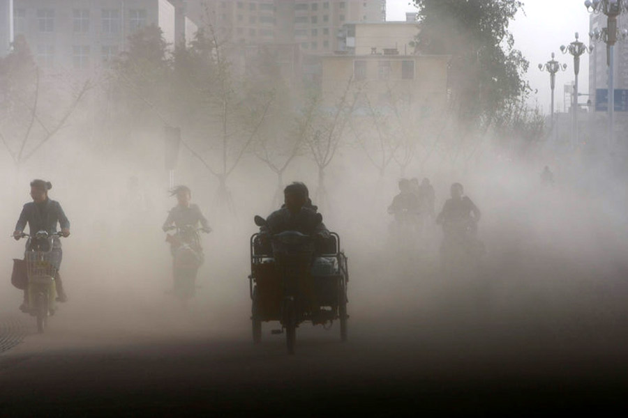 周日(18日), 河北石家莊,中華大街與裕華路交口,自行車在大風引起的揚塵中艱難前行。10月18日起,北方迎來大幅降溫,部分地區(qū)風力將達8級。 阿拉爾 攝