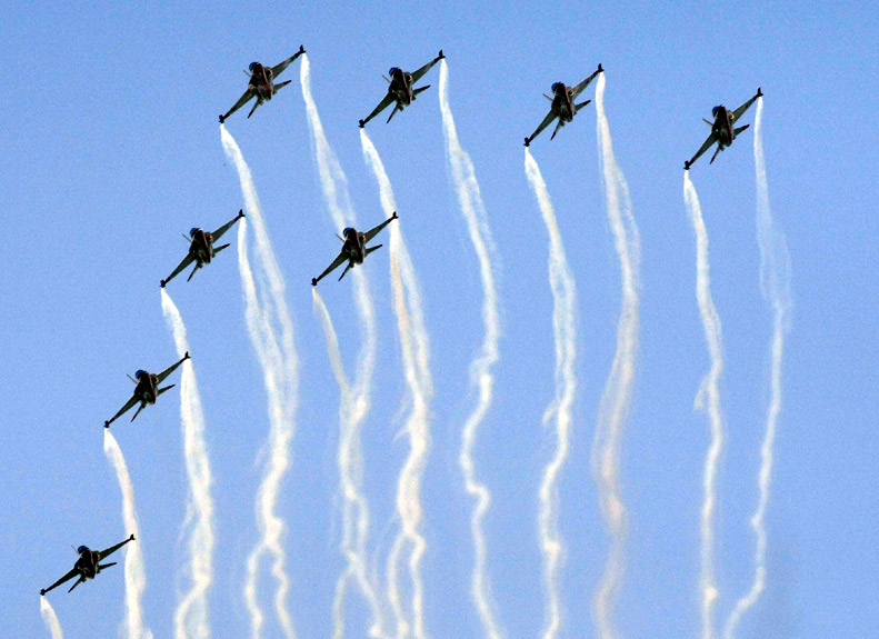 周二(20日),韓國(guó)黑鷹特技飛行表演隊(duì)在2009首爾國(guó)際航空航天與國(guó)防展上進(jìn)行精彩的特技飛行表演。 來(lái)源:中國(guó)新聞網(wǎng)
