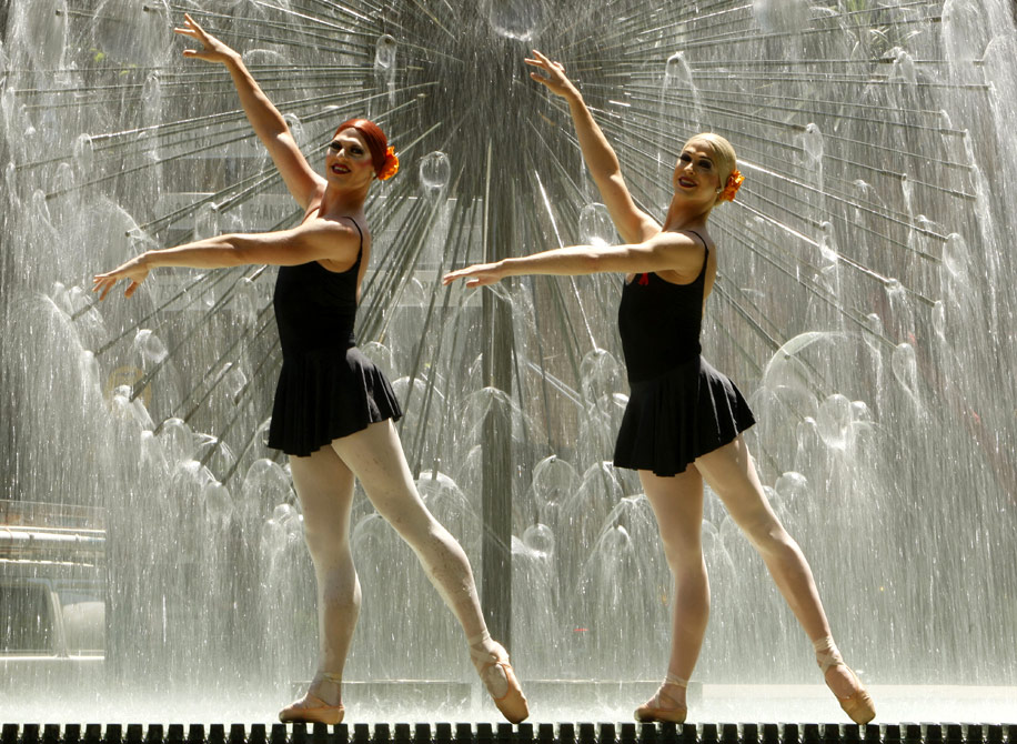 2009年10月23日,澳大利亞悉尼,來自紐約的全男班惹笑芭蕾舞團(tuán)The Trocks在噴泉邊起舞。高超的足尖技巧,優(yōu)美的芭蕾舞姿,加上怪異的動(dòng)作滑稽的表情,這些美國(guó)男子芭蕾演員們用一種另類的表現(xiàn)力顛覆了人們心中優(yōu)雅高貴的印象,讓觀眾欣賞傳統(tǒng)以外的男扮女裝芭蕾舞表演。