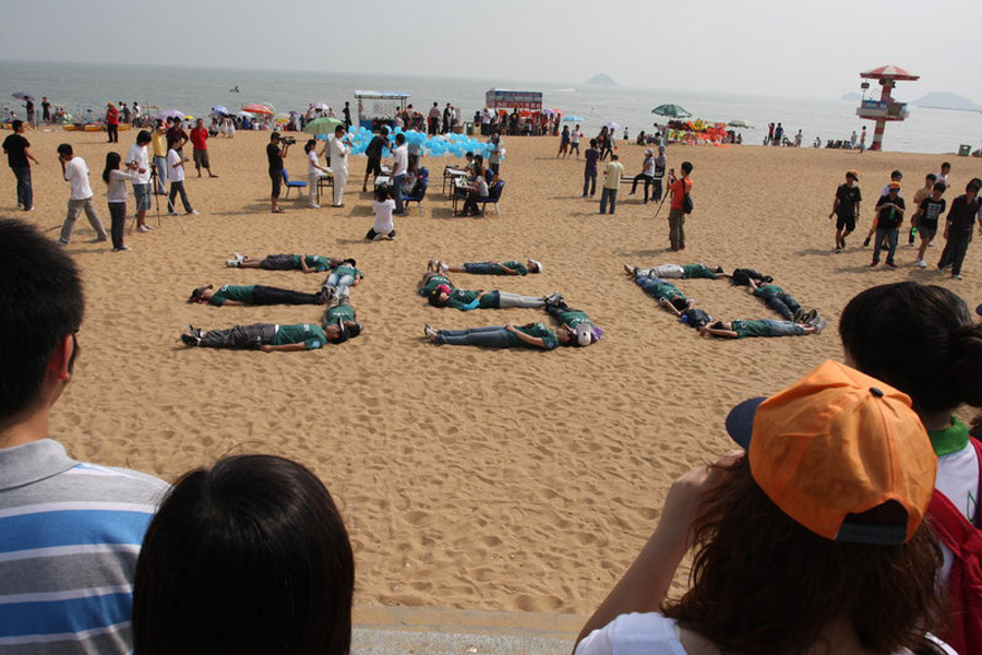 2009年10月24日,當(dāng)日是350全球應(yīng)對氣候變化行動日,世界各地的民眾紛紛用自己的方式來表示對全球氣候變化的關(guān)注和擔(dān)憂。圖為中國廣東珠海海濱泳場,大學(xué)生進(jìn)行海灘辦公的行為藝術(shù)。鐘凡 攝