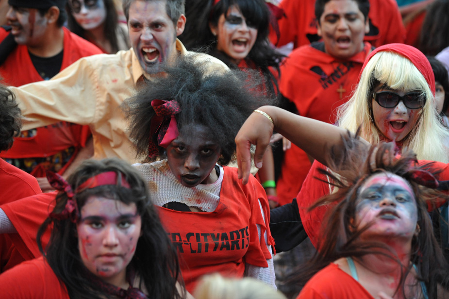 25日,“戰(zhàn)栗全世界”活動在全球300多座城市同期舉行,全球一共有大約20000人同時跳起了邁克·杰克遜著名的戰(zhàn)栗舞。歌迷們借此表達(dá)了對這位流行音樂之王的哀思。并且刷新了全世界最多人同時跳舞的世界紀(jì)錄。圖為在美國洛杉磯,歌迷跳起“戰(zhàn)栗舞”。