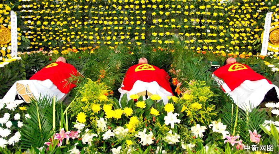 陳及時(shí)、何東旭、方招三 位英雄的遺體安放在鮮花叢中。曾尉 攝