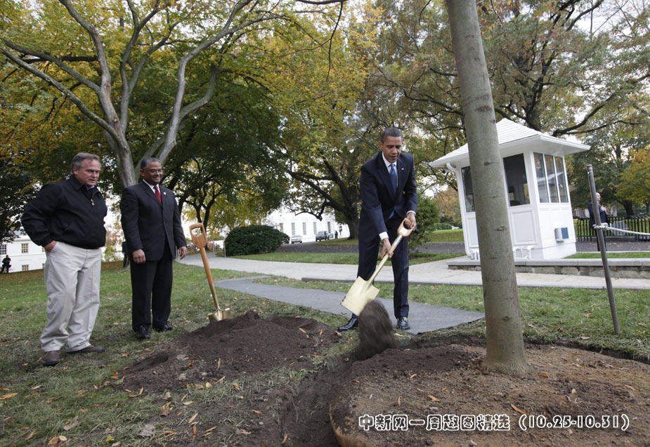 10月28日,美國華盛頓,總統(tǒng)奧巴馬在白宮北草坪上植樹。前總統(tǒng)布什曾于2008年4月在同樣的位置種下一棵樹,但未能成活。>>點(diǎn)擊觀看詳細(xì)內(nèi)容