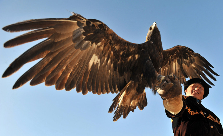 10月30日,在吉爾吉斯斯坦Bokonbayevo傳統(tǒng)的狩獵節(jié)上,一只捕獵鳥在追獵物。圖片來(lái)源:中國(guó)新聞網(wǎng)