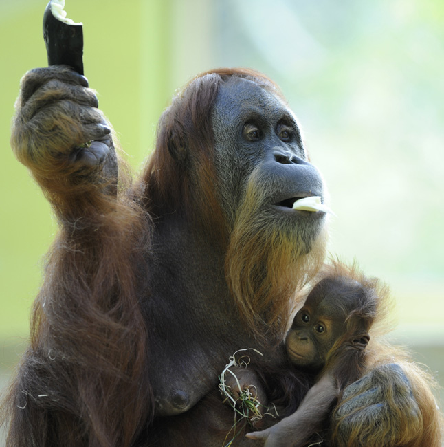 周二(27日),在德國慕尼黑的一家動物園里,一只紅毛猩猩懷抱著它四個月大的孩子。 來源:中國新聞網(wǎng)