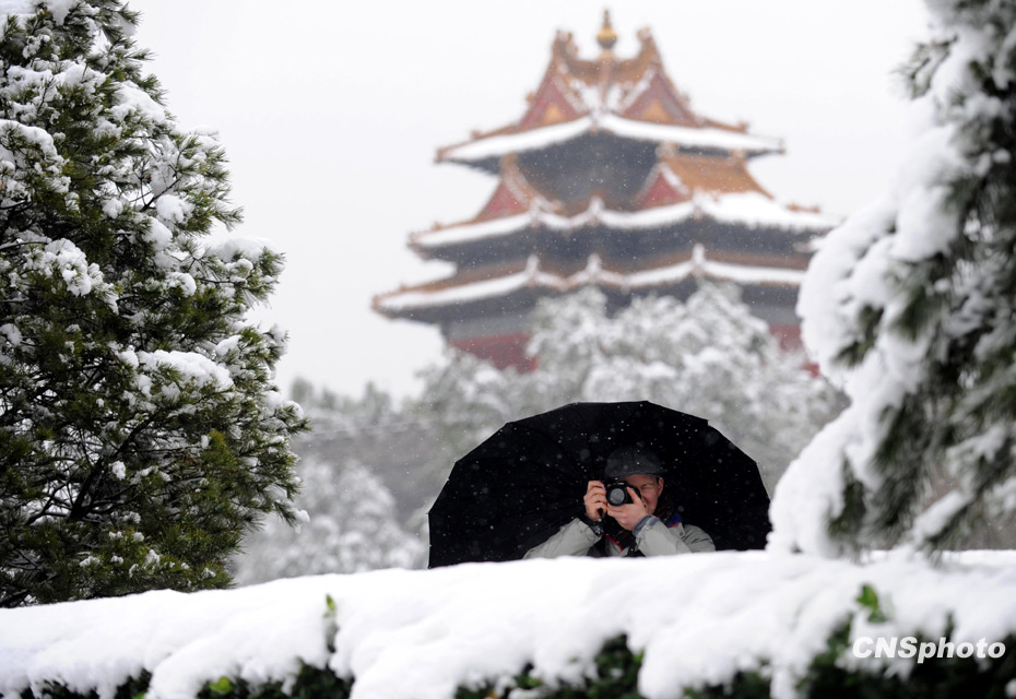 11月1日,深秋的北京大雪紛飛銀裝素裹,一名外國人在故宮角樓附近拍攝雪景。北京今年的初雪時(shí)間提前了整整一個(gè)月。中新社發(fā) 廖攀 攝