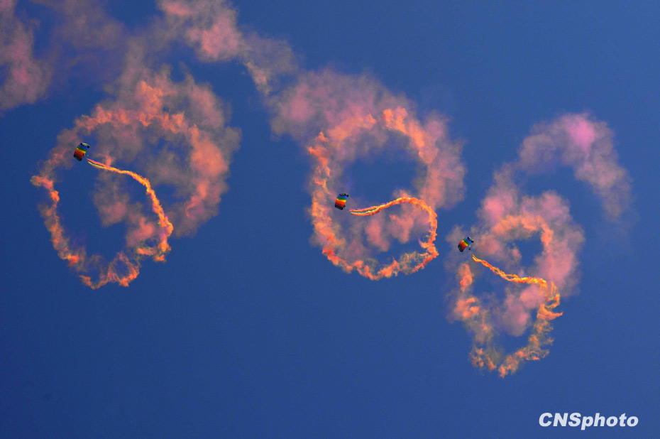 十一月三日,空軍八一飛行表演隊(duì)和空軍八一跳傘隊(duì)在北京沙河機(jī)場舉行預(yù)演,迎接十一月十一日中國人民解放軍空軍建軍六十周年。圖為空軍八一跳傘隊(duì)表演。中新社發(fā) 潘旭臨 攝