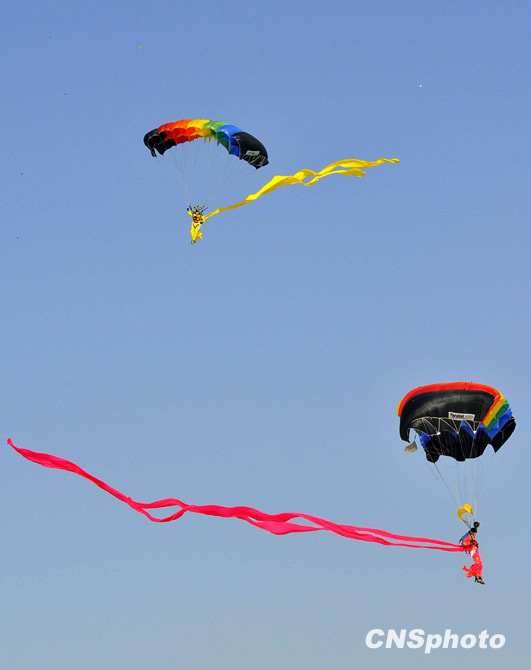 十一月三日,空軍八一飛行表演隊和空軍八一跳傘隊在北京沙河機場舉行預演,迎接中國人民解放軍空軍建軍六十周年。圖為空軍八一跳傘隊表演的仙女下凡。中新社發(fā) 潘旭臨 攝