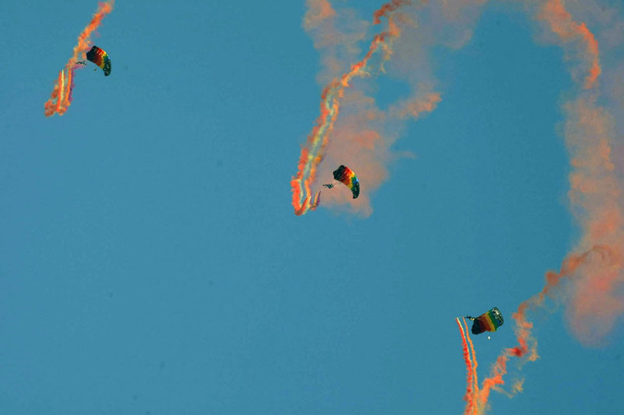 11月3日上午,慶?哲娊ㄜ60周年空中表演在沙河機(jī)場(chǎng)舉行首場(chǎng)預(yù)演。八一跳傘隊(duì)共有24名隊(duì)員表演開路先鋒、空中彩虹、歡慶盛典和仙女下凡4個(gè)節(jié)目。黑克 張穎川 攝