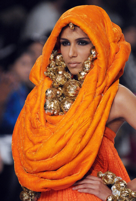 11月5日,巴基斯坦第一屆時(shí)裝周在卡拉奇拉開(kāi)帷幕。美女模特們身著裸露雙肩和肚臍的非伊斯蘭傳統(tǒng)服裝在T臺(tái)上走秀。