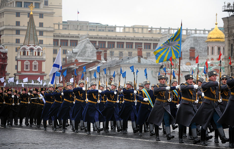 11月7日,俄羅斯士兵身穿二戰(zhàn)時(shí)期的軍服在莫斯科紅場舉行閱兵閱兵式紀(jì)念1941年紅場閱兵。圖片來源:中國新聞網(wǎng)