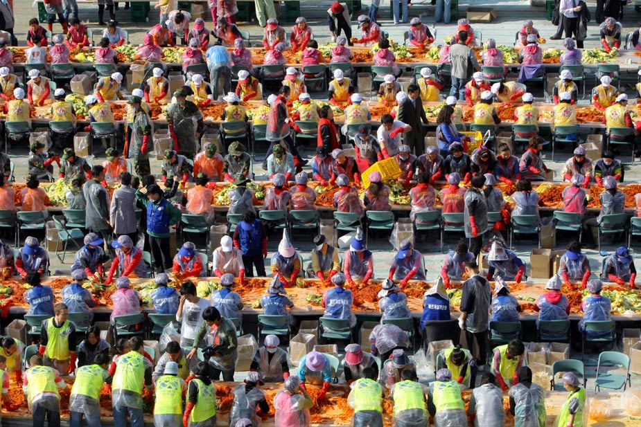 韓國(guó)數(shù)千民眾操場(chǎng)上集體做泡菜