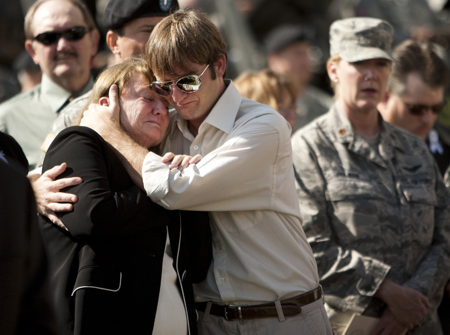 2009年11月10日,在美國得克薩斯州胡德堡陸軍基地,槍擊案遇害士兵的親屬參加悼念儀式。當日,美國德克薩斯州胡德堡陸軍基地舉行儀式悼念槍擊案遇難者。 圖片來源:中國新聞網