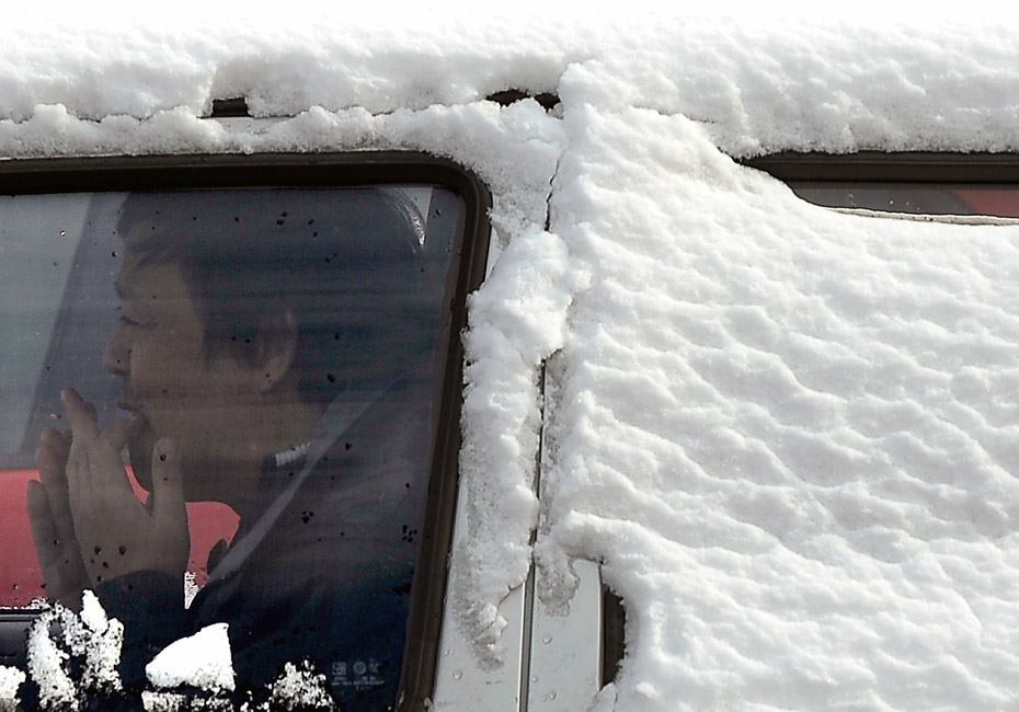 圖為一個人坐在大雪覆蓋的汽車內(nèi)。