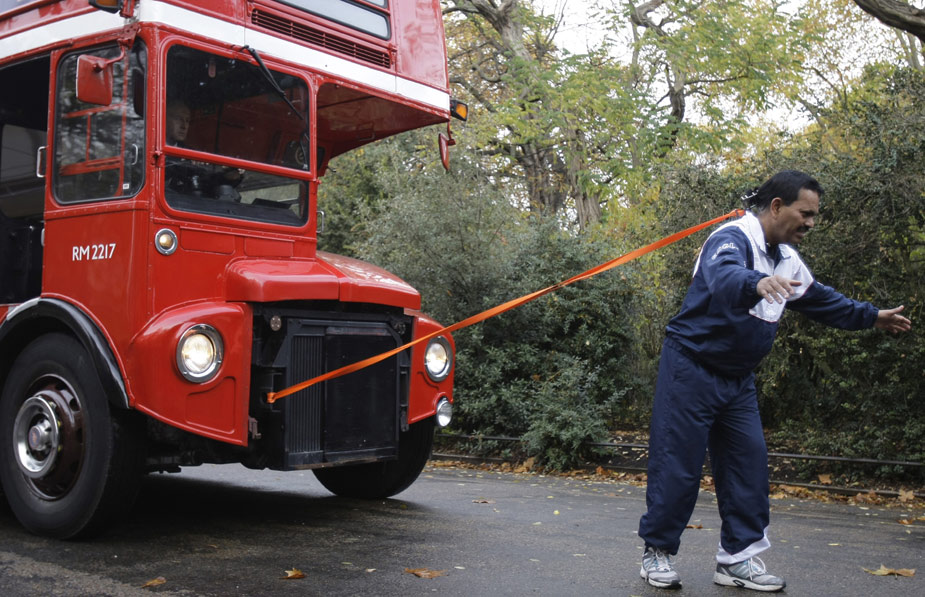 11月12日,一位名叫曼吉特·辛格的牛人在倫敦一個(gè)公園內(nèi)以21.2米的成績(jī)打破了用頭發(fā)拉動(dòng)雙層巴士最遠(yuǎn)距離的吉尼斯世界紀(jì)錄。圖片來(lái)源:中國(guó)新聞網(wǎng)