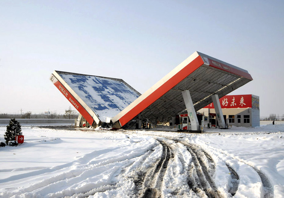11月12日,在山西省長(zhǎng)陵公路長(zhǎng)治市郊區(qū)段,一加油站被大雪壓塌。姚林 攝