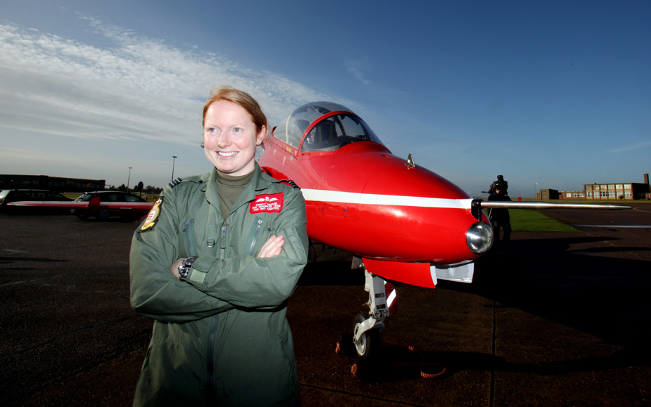 圖為紅箭飛行表演隊首位女飛行員基絲·摩爾中尉與她的飛機。
