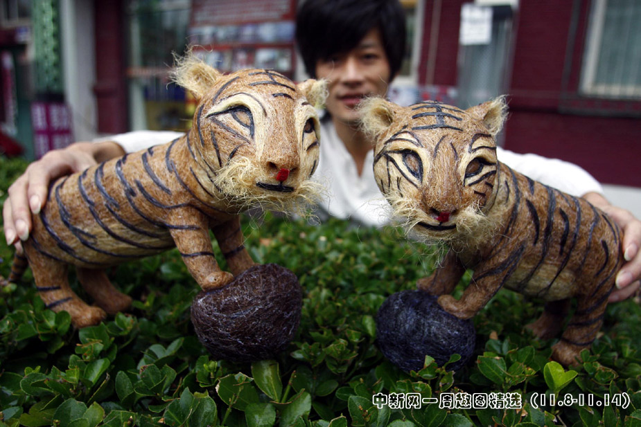 11月9日,北京一位時尚發(fā)型設(shè)計師正在展示頭發(fā)絲作品“;⑸裢辟R歲虎年。這是祖國60華誕之后的又一新作,四川青年理發(fā)師黃鑫用2.6公斤碎頭發(fā)制作了一對可愛逼真的“;ⅰ,歷時兩個多月的時間才完工。>>點擊觀看詳細內(nèi)容