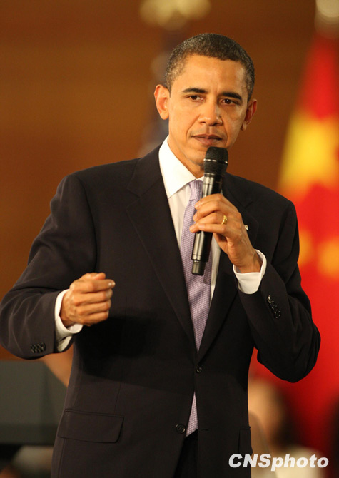 11月16日,正在上海訪問(wèn)的美國(guó)總統(tǒng)奧巴馬現(xiàn)身位于浦東的上?萍拣^,與四百余中國(guó)青年進(jìn)行面對(duì)面交流。 圖片來(lái)源:中國(guó)新聞網(wǎng)