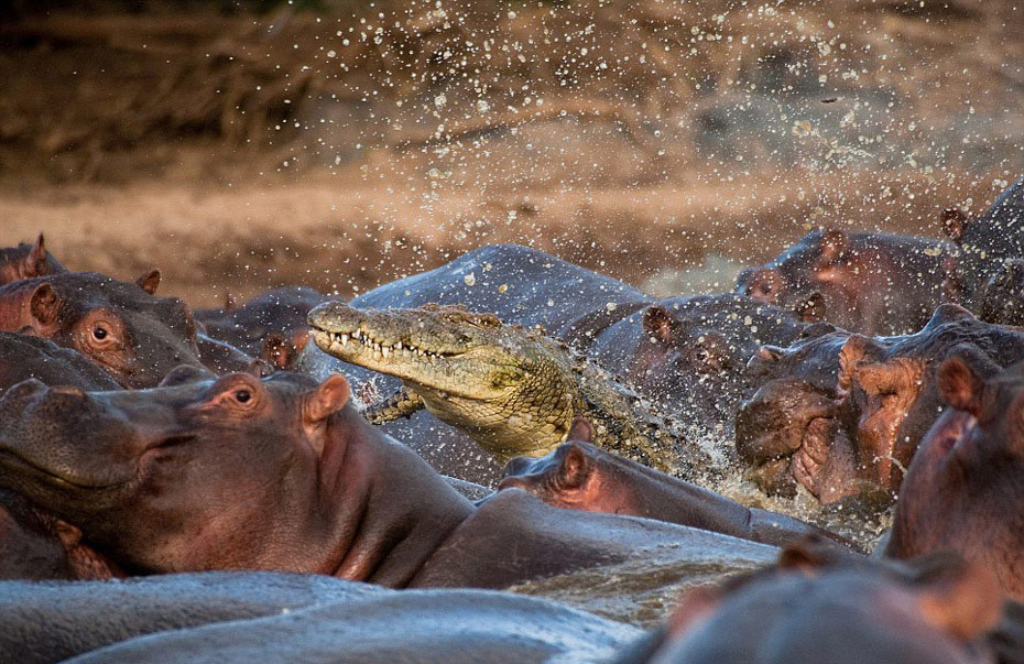 45歲的捷克野生動(dòng)物攝影師Vaclav Silha日前在坦桑尼亞塞倫蓋蒂?lài)?guó)家公園里拍攝到了非常令人震撼的場(chǎng)面。當(dāng)時(shí),一條鱷魚(yú)悄悄混入了一群正在河里洗澡的河馬中,但由于與一頭帶著小河馬的河馬媽媽太過(guò)接近,它很快就被敏感的母河馬發(fā)現(xiàn)。憤怒的河馬們立刻對(duì)它發(fā)起了猛烈地攻擊,這條冒失的鱷魚(yú)很快死于非命。這組照片中的一張最早刊登于英國(guó)廣播公司(BBC)《野生動(dòng)物》雜志的11月號(hào)。