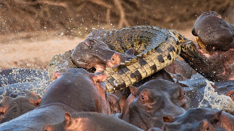 一條鱷魚悄悄混入了正在河里洗澡的河馬中,它很快就被敏感的母河馬發(fā)現(xiàn)。憤怒的河馬們立刻對它發(fā)起了猛烈地攻擊,這條冒失的鱷魚很快死于非命。