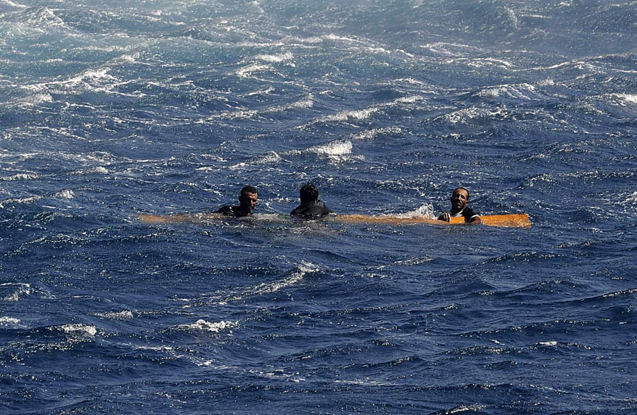 11月17日,亞丁灣,3名漁民抱著木板在海面上漂流3天后獲救。據(jù)悉,他們?cè)庥隽耸畮酌伤坪1I的劫持,海盜們讓其選擇或跳海逃生或被殺死。圖片來(lái)源:中國(guó)新聞網(wǎng)