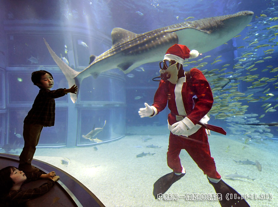11月19日,一名裝扮成圣誕老人的潛水員在日本大阪水旅館的水族箱內歡迎游客光臨。這是該水族館為了迎接每年一度的圣誕節(jié)而搞的活動。圖片來源:中國新聞網>>點擊觀看詳細內容