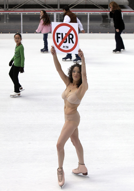 11月24日,美國花樣滑冰的傳奇人物、1979年世界花滑錦標賽冠軍得主芭比洛尼在紐約洛克菲勒廣場復(fù)出“裸滑”。這次表演是為了支持善待動物協(xié)會的反對皮草行動。