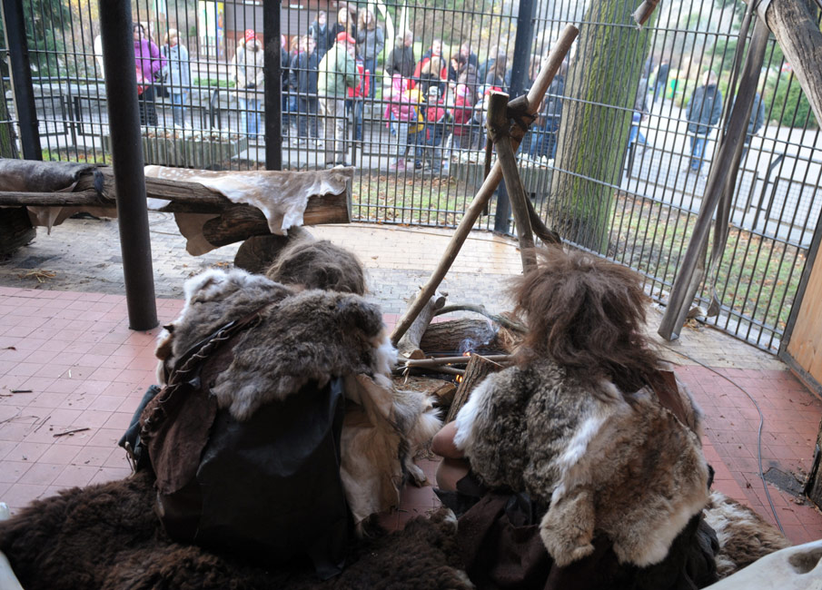 11月27日,波蘭首都華沙動(dòng)物園里,一男一女兩個(gè)志愿者扮成原始洞穴人向參觀者進(jìn)行展示。圖片來源:中國新聞網(wǎng)