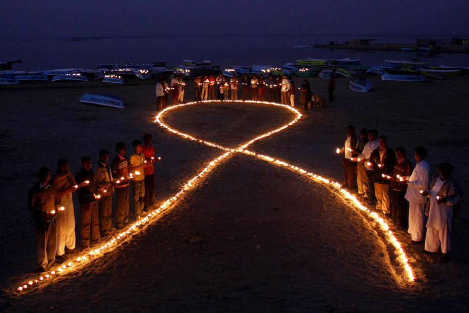 11月30日,印度那薩羅瓦,數(shù)十名村民在海灘上用油燈組成象征艾滋病防治的紅絲帶迎接世界艾滋病日。12月1日是世界艾滋病日,2009年世界艾滋病日的主題是“普遍可及和人權(quán)”。世界各地民眾組織各種活動(dòng)呼吁人們關(guān)注艾滋病。圖片來(lái)源:中國(guó)新聞網(wǎng)