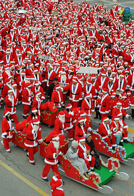 12月1日,韓國(guó)首都首爾市,一千多名“圣誕老人”舉行游行為社會(huì)慈善項(xiàng)目籌款。圖片來源:中國(guó)新聞網(wǎng)