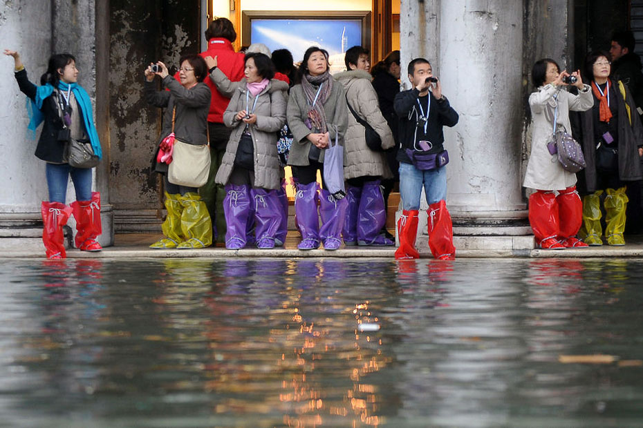 圖為一群游客穿著雨靴在被水淹沒(méi)的圣馬可廣場(chǎng)上拍照。