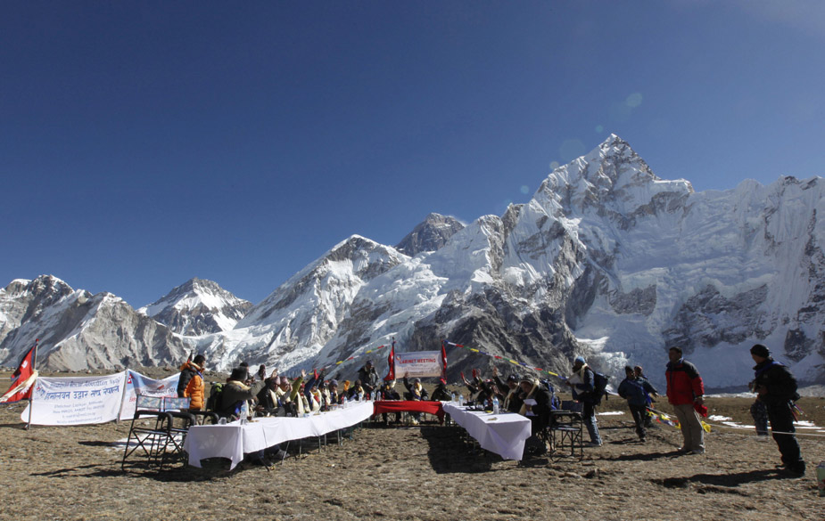 12月4日,尼泊爾總理和22位部長(zhǎng)在喜馬拉雅山海拔5262米的高度舉行內(nèi)閣會(huì)議,討論全球變暖對(duì)喜馬拉雅山的影響。圖片來(lái)源:中國(guó)新聞網(wǎng)